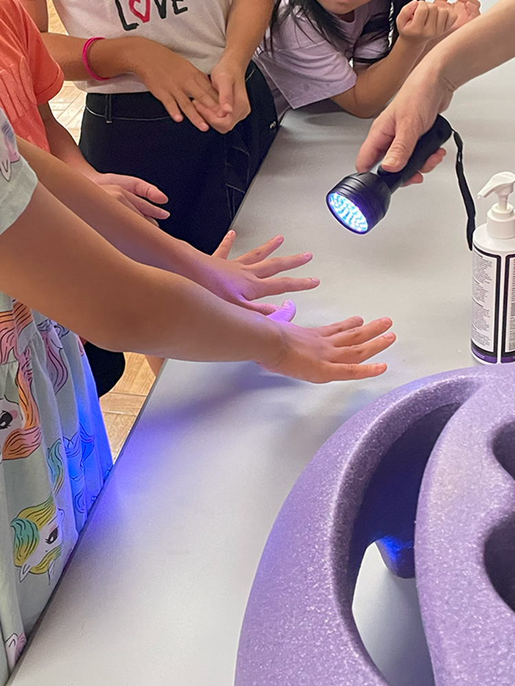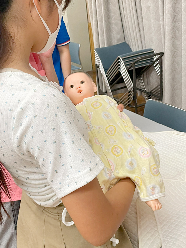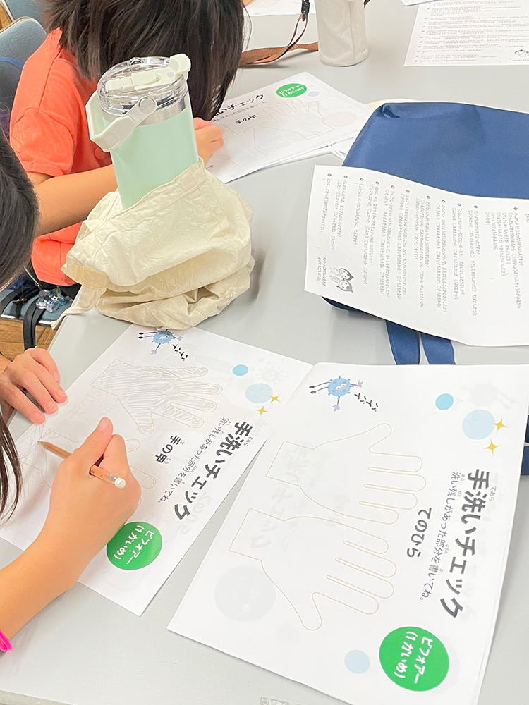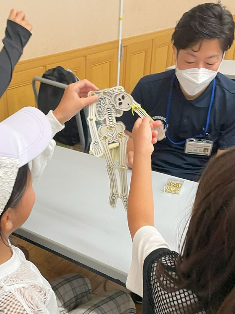 体験ブースでは、赤ちゃんのお世話体験、車いすでの市役所館内の移動、ブラックライトを使った手洗いチェック、骸骨モビール作り、握力測定、聴診器で心臓やおなかの音を聴く体験など、多彩なプログラムを用意。子どもたちは興味津々で取り組んでいました。