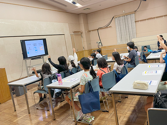 はじめに学生と教員による読み聞かせ『ころんだタロウとからだのヒーローたち!』を実施。看護師や理学療法士の仕事について、クイズや実演を交えながら楽しく学んでいただきました。